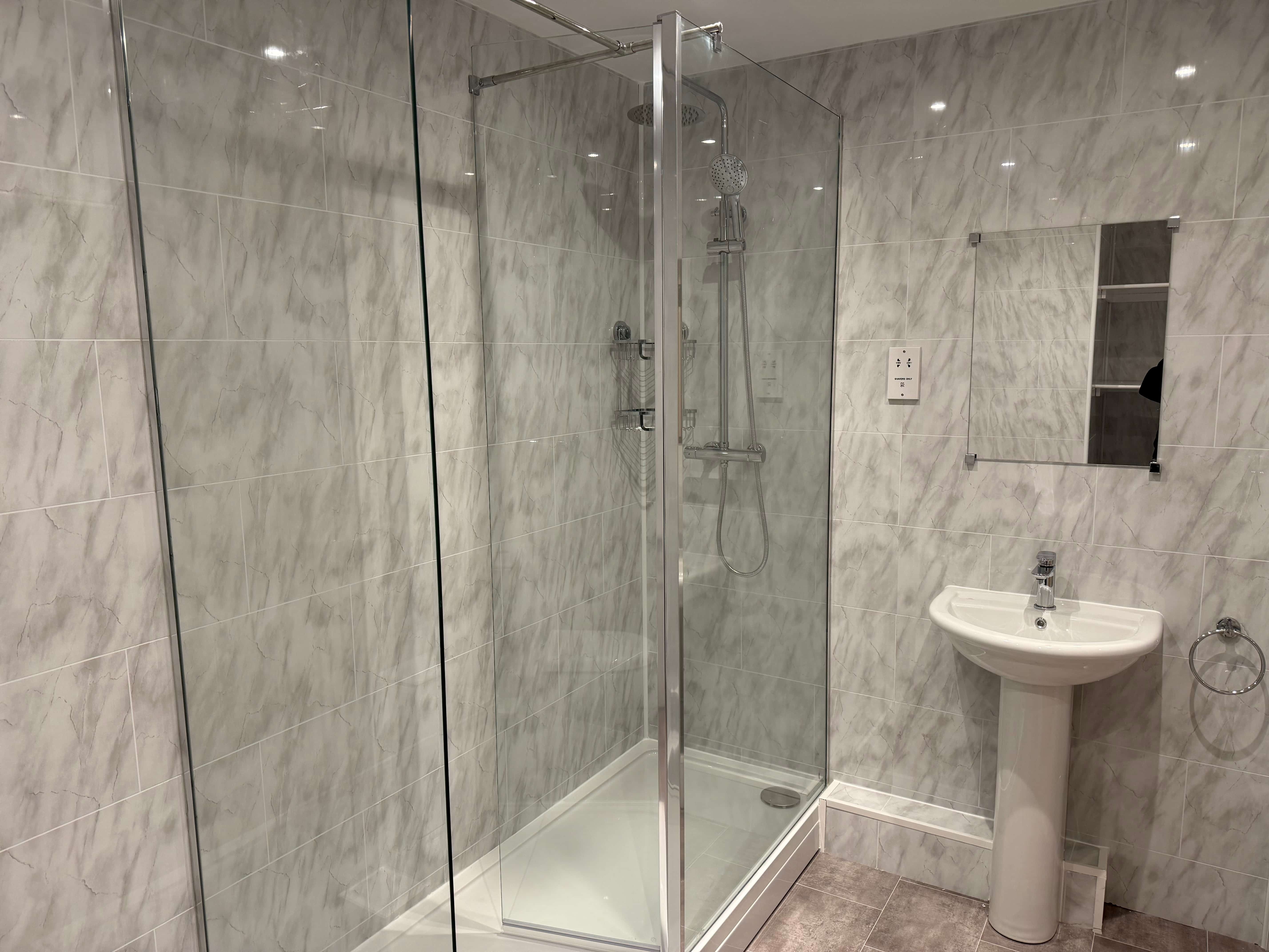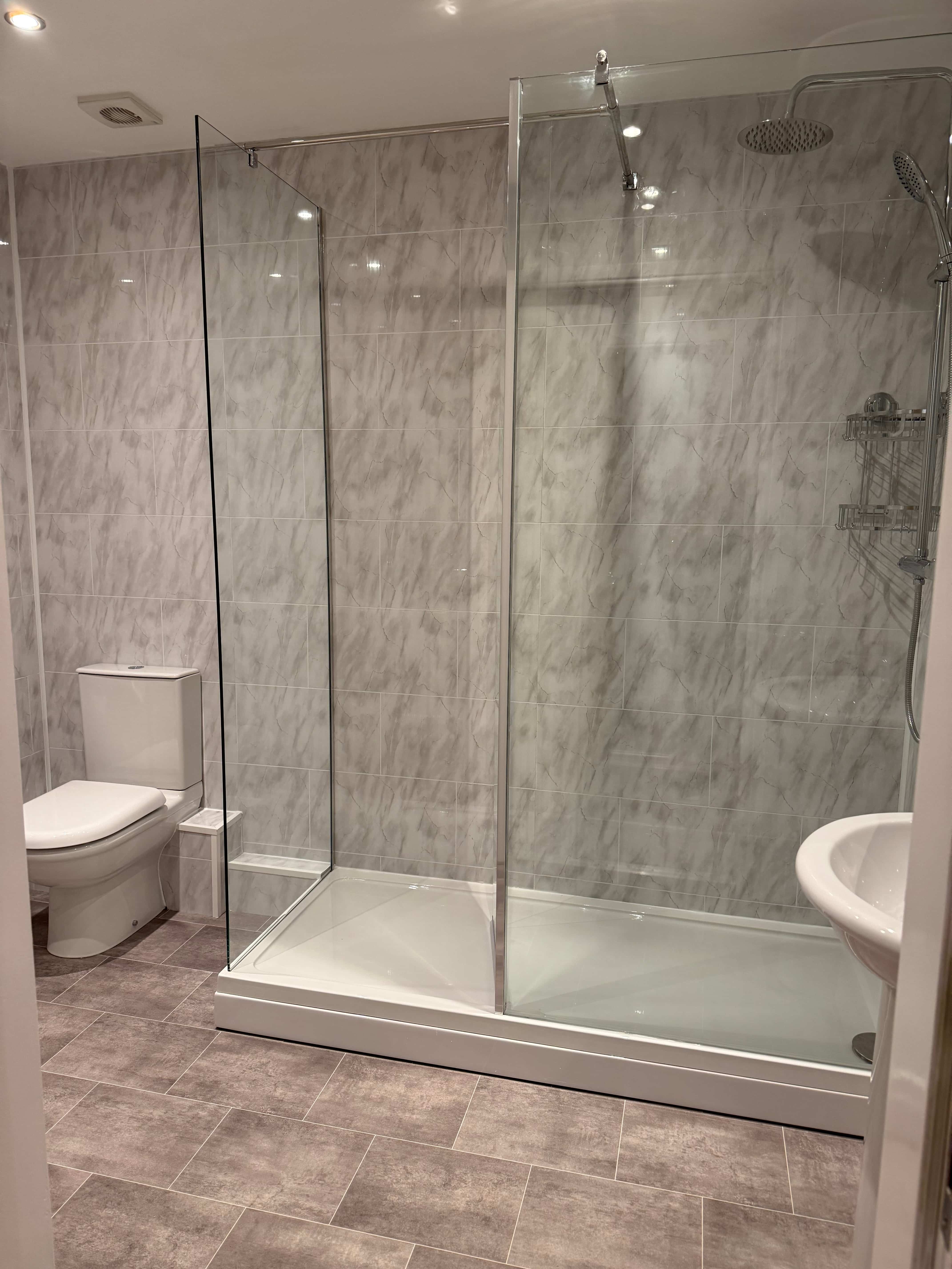 “Another small switch we were able to make was by using PVC classing wall panels, again instead of tile. With all the money saved on tiling, we were able to buy and install a whole new shower room with a new basin, shower, toilet, and cupboard. We removed the bath to give the tenant more storage space, and both Noel and the tenant were very happy with the result.